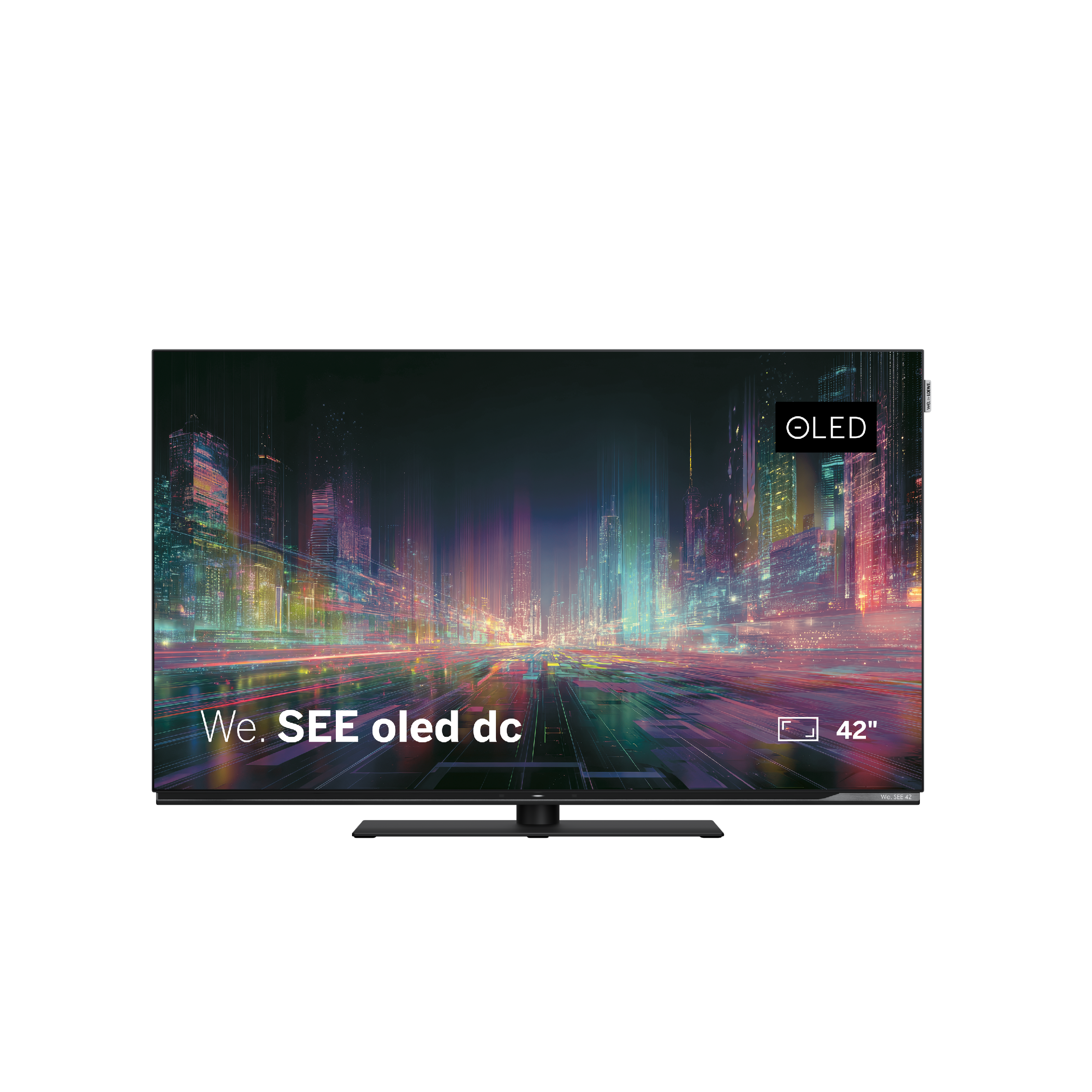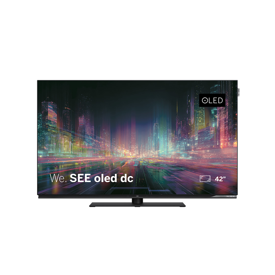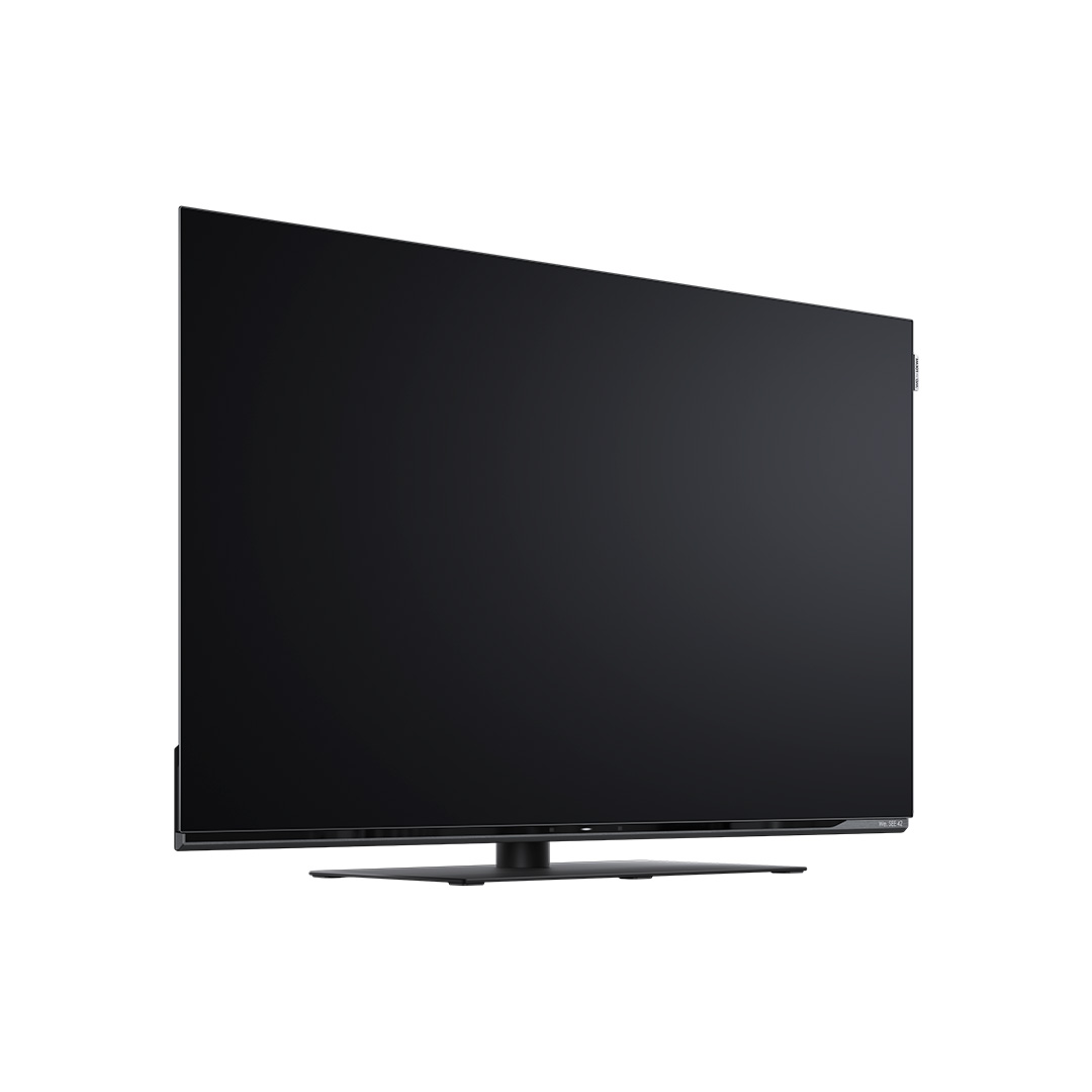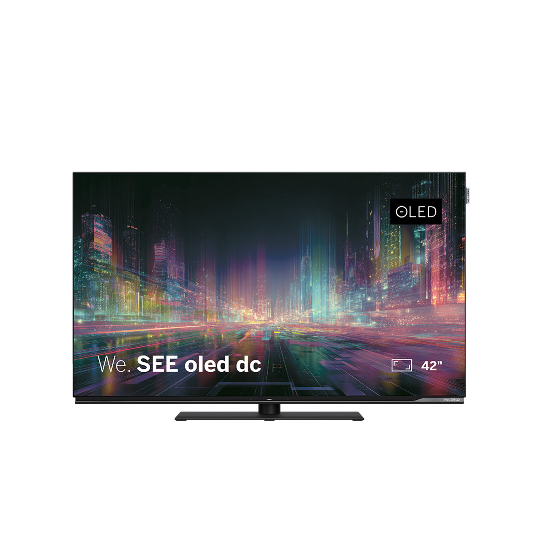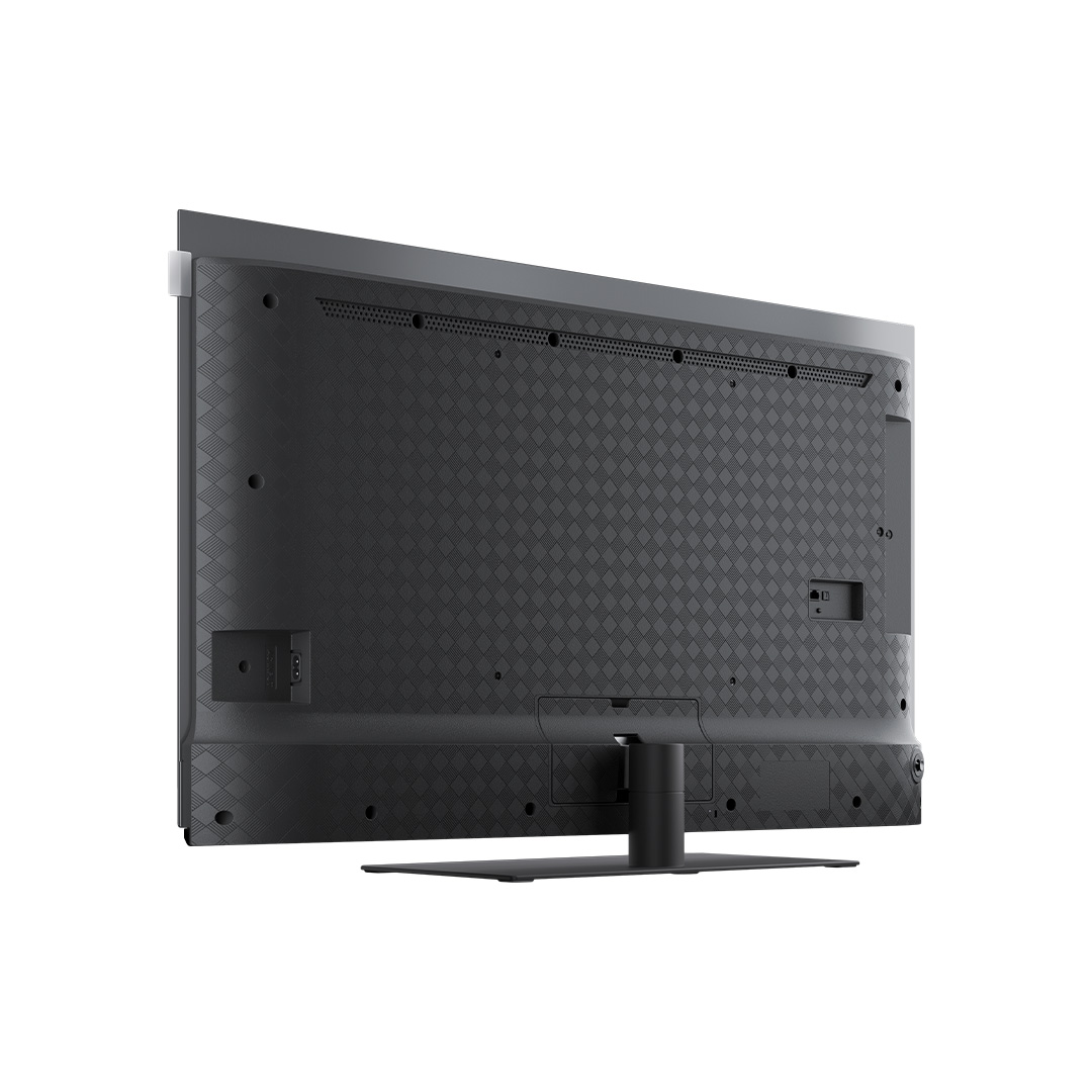 A modern and sleek design, the We. SEE OLED is slim and narrow with structured rear cabinet that partially covers the side connections. VESA domes are found within the main metal structure, allowing you to securely mount your TV to the wall. Alternatively, the TV is provided with a solid, metal, rotatable table stand that has a spray-painted finish to perfectly match the main cabinet colour, coal black.