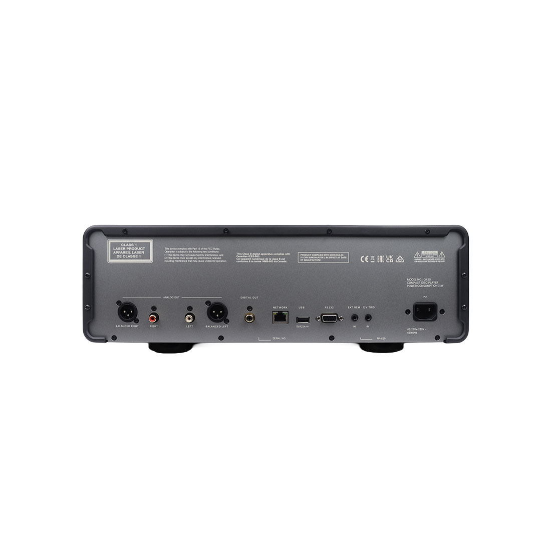 Designed for seamless system integration, the Q430 offers both RCA single‑ended and fully balanced XLR outputs, ensuring optimal compatibility with a wide range of preamplifiers and integrated amplifiers. The front‑panel full‑colour TFT display showcases album artwork and detailed playback information, bringing your CD library to life. A precision‑milled aluminium chassis, exceptional build quality, and an elegant aluminium remote control further reinforce its purpose: a dedicated disc player engineered for performance, reliability, and long‑lasting enjoyment.